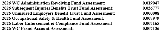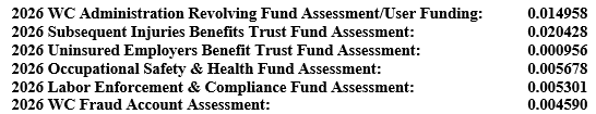 Oakland, CA -- The California Department of Industrial Relations (DIR) has issued the 2026 assessments that workers’ compensation insurers are required to collect from policyholders to cover the budget of the state Division of Workers’ Compensation (DWC) and five related programs set up by state lawmakers. Insurers should apply the following rates against their policyholders’ estimated annual assessable premium for policies incepting January 1, 2026 through December 31, 2026: